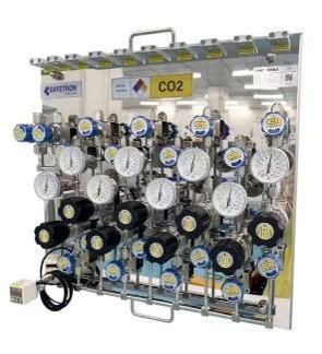 BSGR products are mainly used in high-capacity inert gas conveying systems. The gas source is stored in large capacity inert gas cylinders, transported through BSGR supply cabinets to the inert gas pipeline network, and then transported from the inert gas pipeline network to various usage points through VMP. Its core technology lies in the optional steel cylinder heating device and J-T heater according to the process flow requirements, which can be independently heated and controlled in one and two stages, stably conveying inert gas for large capacity packaging (Y bottles, T bottles, ISO Tank, torpedo tube car)